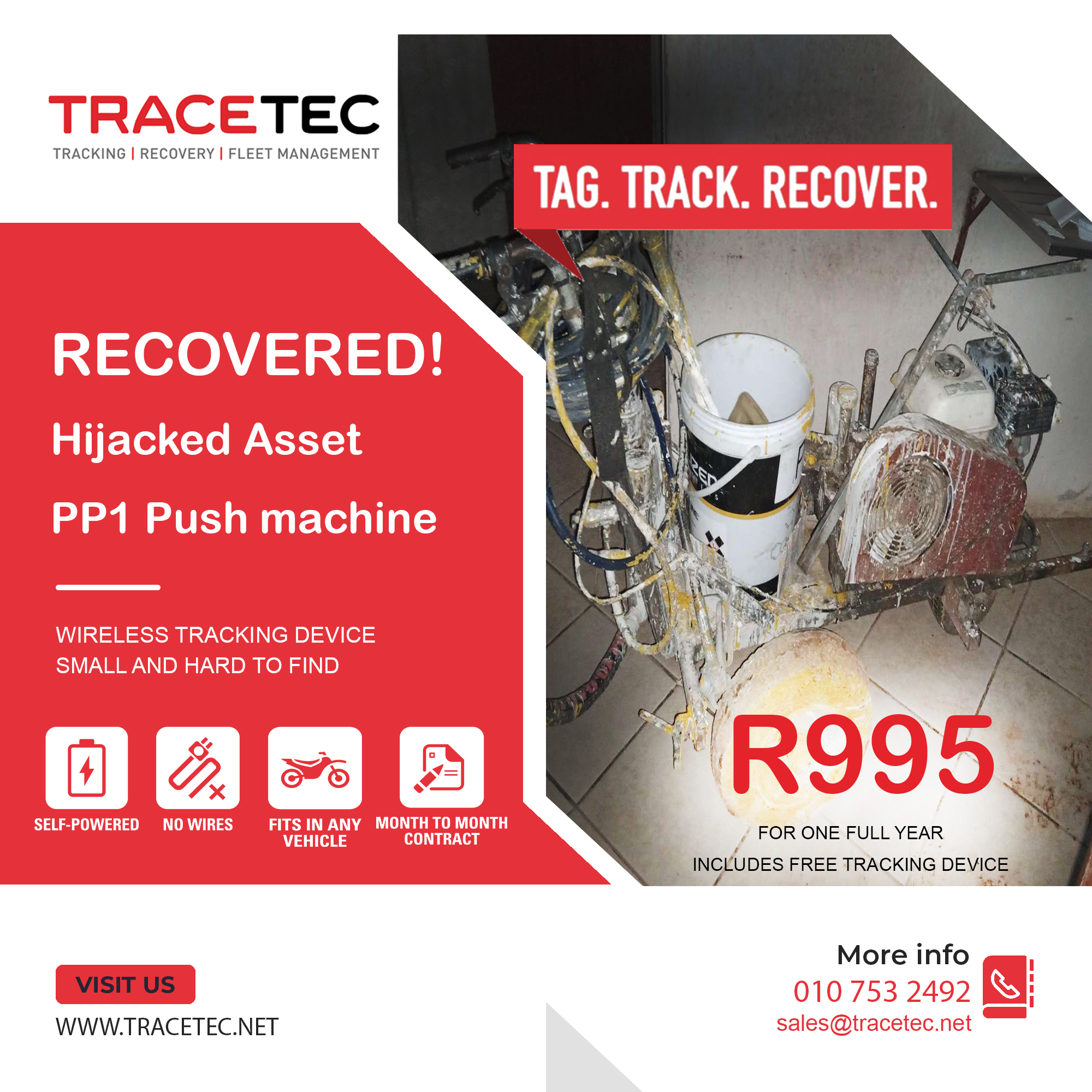 The Tracetec 24-hour control room was notified about a hijacking of a PP1 Push Compressor in Orange farm Johannesburg.